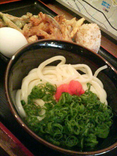 うどんにおにぎりに野菜のかき揚げにちくわにゴーヤーに腹いっぱい!